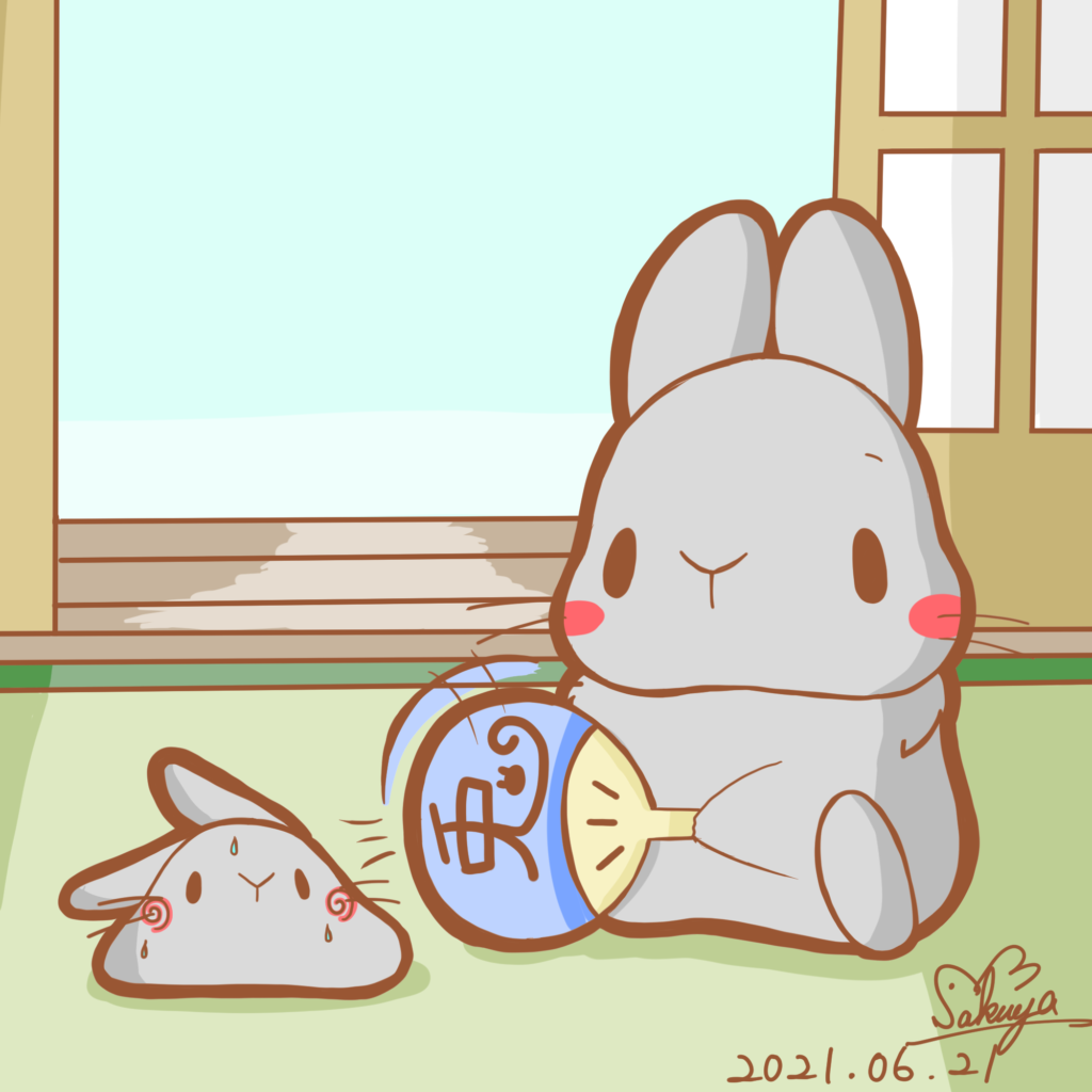 暑さでチビちゃんは溶けてしまいそうなので、急いでうさぎさんが仰いであげています!